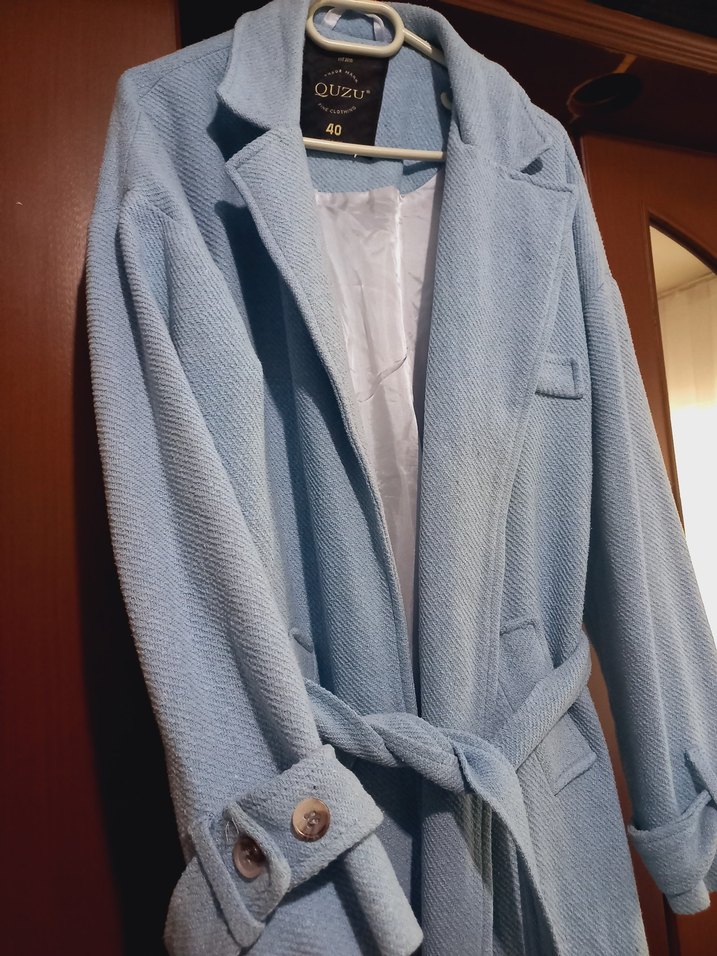 Quzu marka, açık mavi renkli, kemerli ve düğmeli manşetli yumuşak dokulu kadın kaban. İç kısmı astarlıdır.