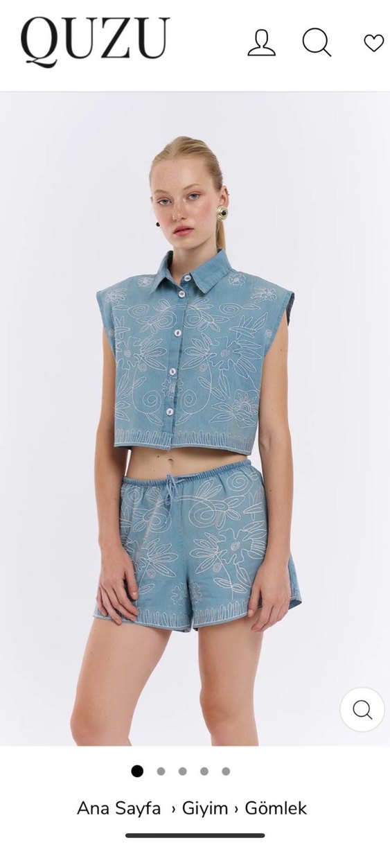 Şuanki fiyatı 1800 TL Pastel mavi renkte, düğmeli, kolsuz ve straplez yakalı, bol kesim denim mini tulum. Hafif batik desenli, rahat sokak stili için uygun.