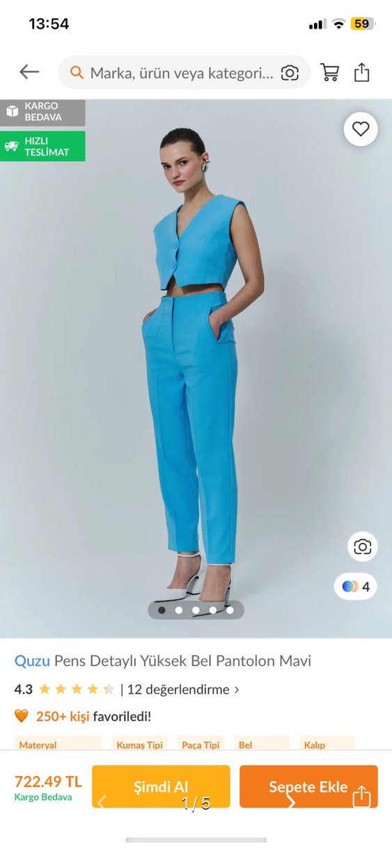 Quzu'nun mavi denim yüksek bel cigarette pantolonu, pens detayları ve normal kesimi ile ofis için şık bir tercih sunar. Midi boy ve rahat bir görünüm sağlar. ( yelek L beden pantolon m beden)