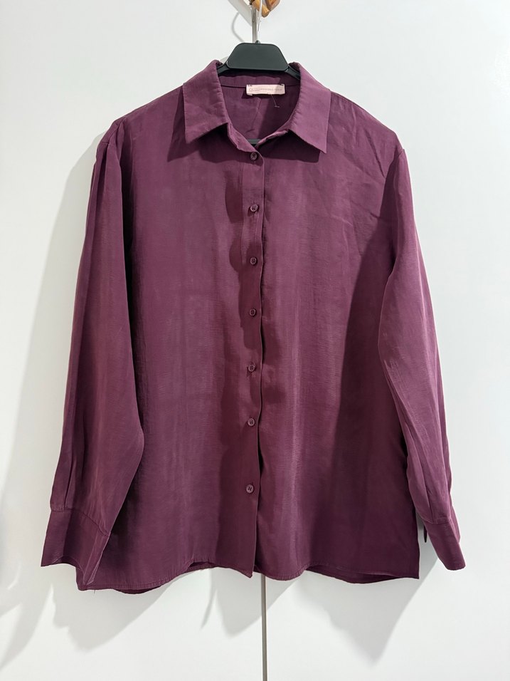 Ouzu marka mürdüm renkli keten kadın gömlek, uzun kollu ve düğmeli ön yapıya sahiptir. Salaş kesimi ve yakalı tasarımı ile ofis için uygundur.