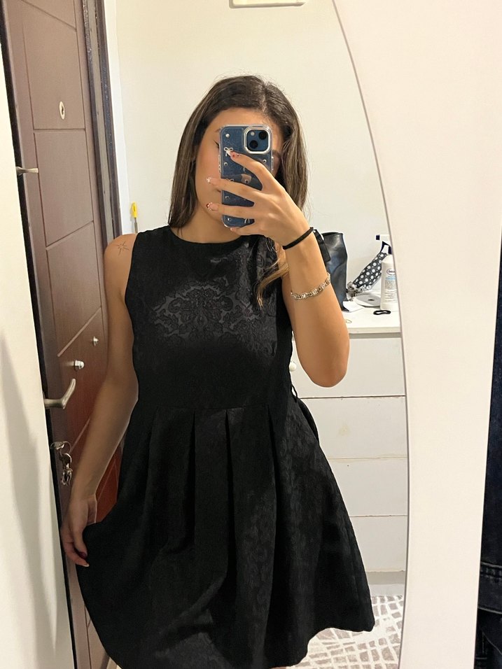 Siyah, parlak yüzeyli, straplez yakalı, kolsuz ve vücuda oturan midi uzunlukta abiye elbisedir. Ofis için uygundur.
