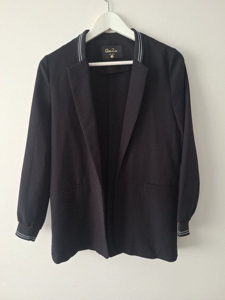 Quzu marka, yaka ve kol kısımlarında beyaz çizgili şerit detayları bulunan, modern kesim siyah blazer ceket. Hem ofis şıklığı hem de günlük kombinler için uygundur. Kumaşı esnektir ve vücuda rahat oturur. Hiçbir kusuru veya lekesi yoktur, yeni gibidir. #quzu #blazer #ceket #siyahceket #ofisstili #smartcasual #38beden