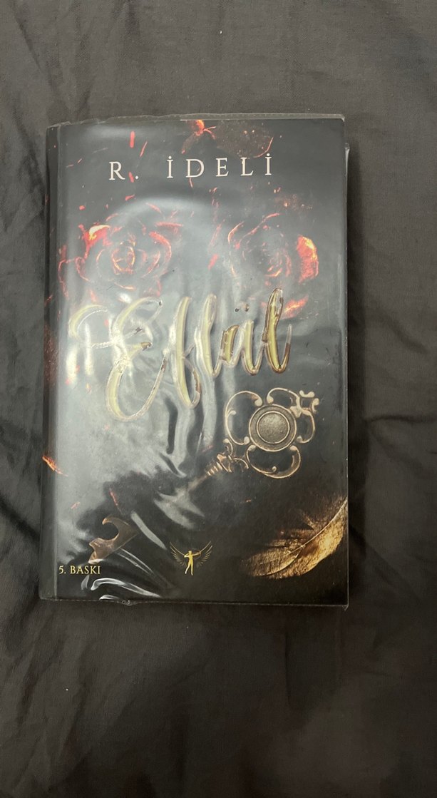 R. İdeli'nin 'Eflat' adlı romanı, koyu kapak üzerinde gül ve tüy çizimleriyle.