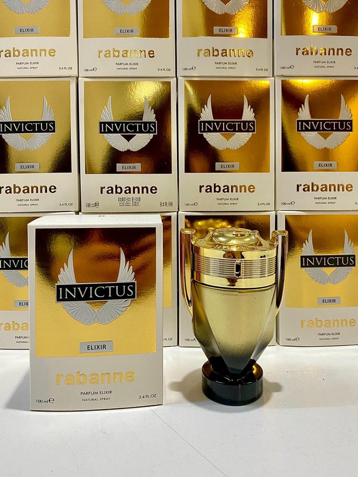 Parlak altın şişede Rabanne Invictus Elixir erkek parfümü, modern klasik tarzda, göz alıcı bir koku sunar. ✨
