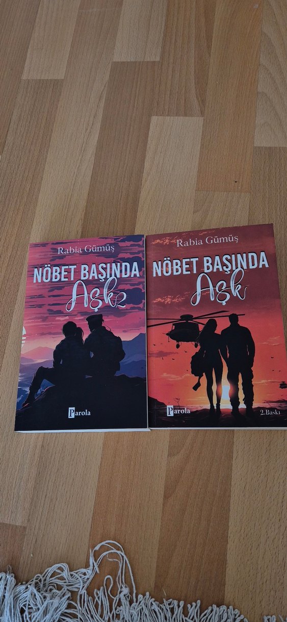 Rabia Gümüş'ün "Nöbet Başında Aşk" adlı iki ciltlik romanı, askerî ve aşk temalı, gün batımı kapaklı kitaplar. 1. alti cizili 2. alti cizili degil soeunsuz