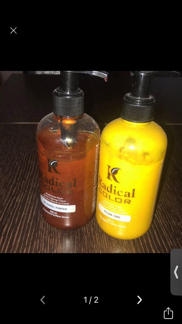 Radical Color saç boyası, kolay kullanım için pompalı şişelerde canlı balkabağı ve sarı tonlar içerir. Çok az kullanıldı. Geçici boya
