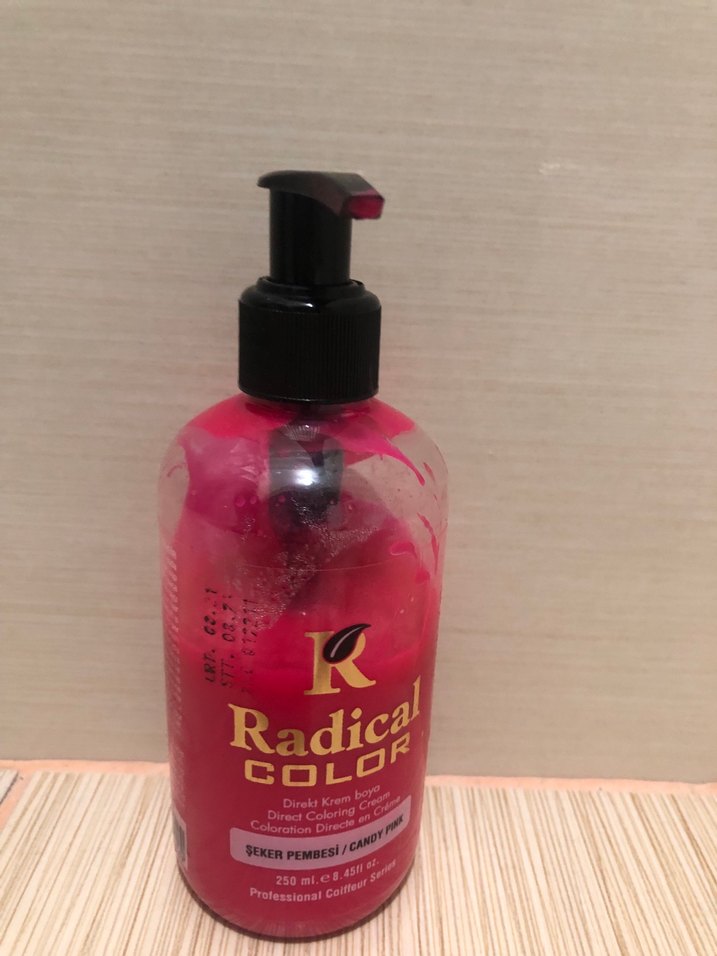 Radical Color şeker pembesi saç boyası, 250 ml pompalı şişede. Canlı renkler için direkt uygulama sağlar.