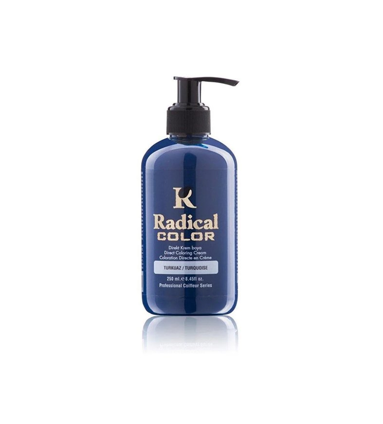 Radical Color saç boyası, turkuaz renkte, 250 ml pompalı şişede, kolay uygulama için profesyonel seriden.