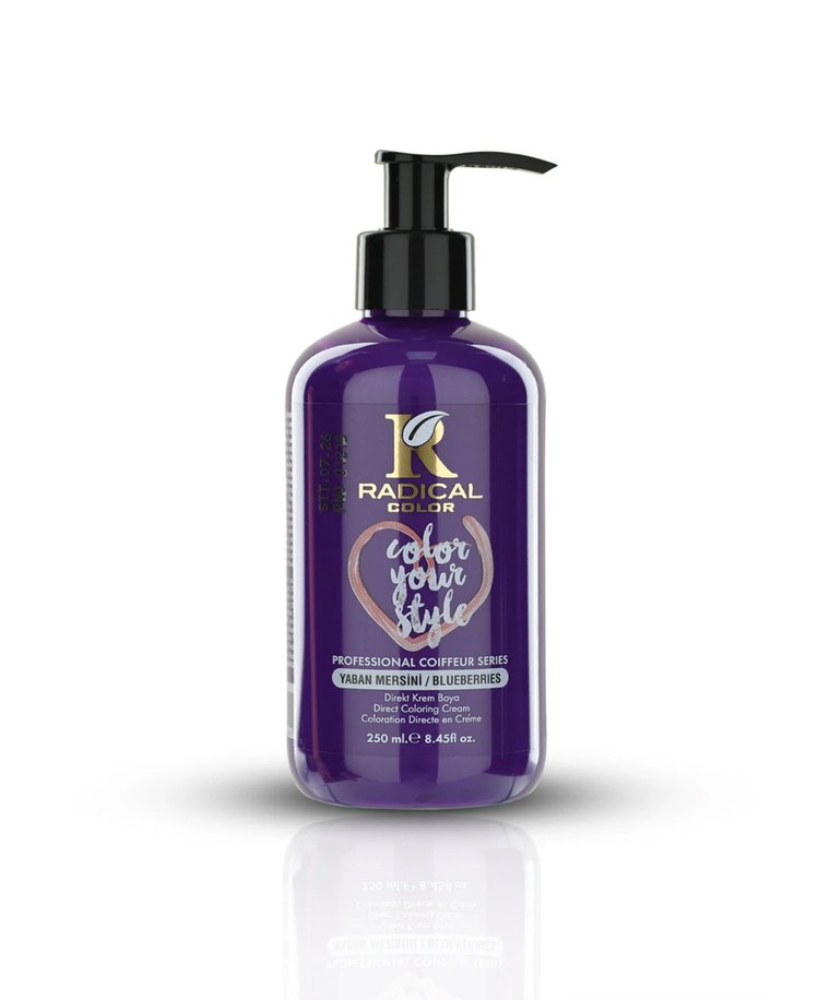 Radical Color profesyonel saç boyası, yaban mersini tonunda, pompalı şişede, canlı renk ve kolay uygulama sağlar.