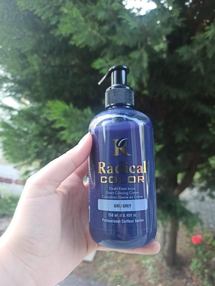 Radical markalı gri renk, 250ml pompalı şişede saç boyası. Profesyonel kullanım için direkt renklendirme kremi.