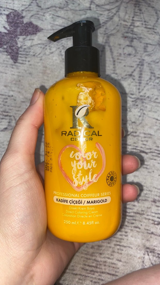 RADICAL Color Kadife Çiçeği saç boyası, 250 ml pompalı şişede, doğrudan krem boya olarak sunulmaktadır. (Neredeyse dolu sadece denendi)