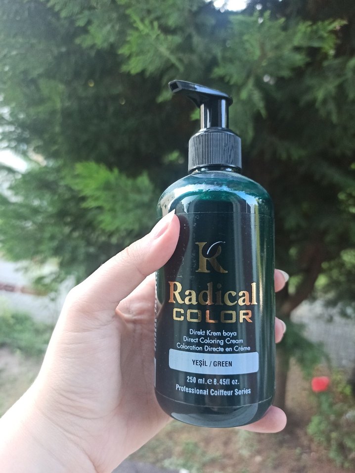 Radical markasının 250 ml pompalı yeşil saç boyası. Profesyonel kuaför serisinden.