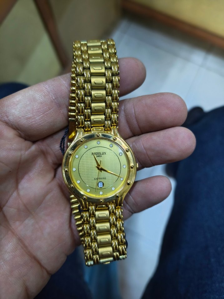 Altın renkli, detaylı kemerli bilezik ve klasik yuvarlak kadranlı kadın saati. Tarih göstergesi ve renkli, zarif tasarım içerir. ⌚ Ürün sıfır