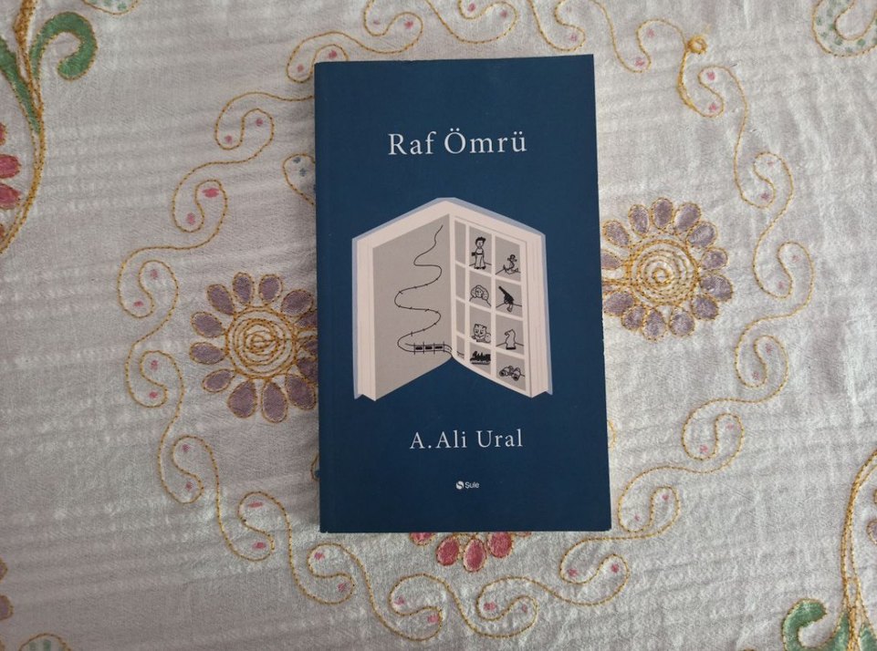 A. Ali Ural'ın "Raf Ömrü" adlı romanı, küçük objelerin yer aldığı minimalist bir dolap çizimiyle kaplanmıştır.