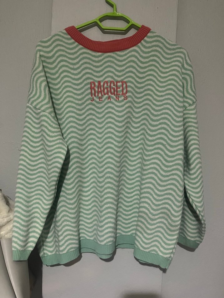Ragged Jeans marka, pastel yeşil baskılı triko kazak. Salaş kesim, uzun kollu, kırmızı yakalı, rahat sokak stili için uygundur. K beden