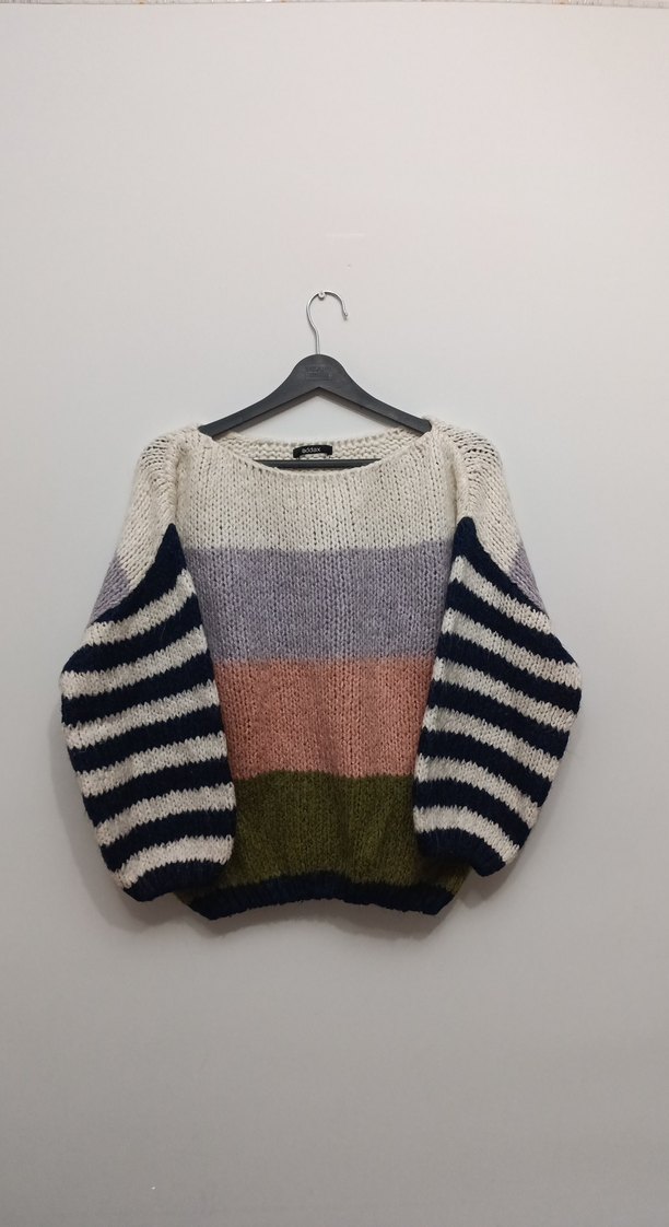 Bu kadın kazak, bol kesim, uzun çizgili kollar ve bisiklet yaka ile tasarlanmıştır. Rahat örgü kumaştan yapılmış, gri, pembe ve yeşil tonlarında çok renkli yatay çizgiler taşır. Kısa boyu ve bohem tarzı ile rahat, retro bir hava sunar. Günlük kullanım için uygundur.