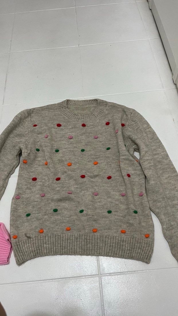 Gri renkli, yuvarlak yaka ve uzun kollu, bol kesim triko kazak. Üzerinde renkli küçük noktalar bulunur, günlük ve sokak tarzı için uygundur. Hic kullanilmadi