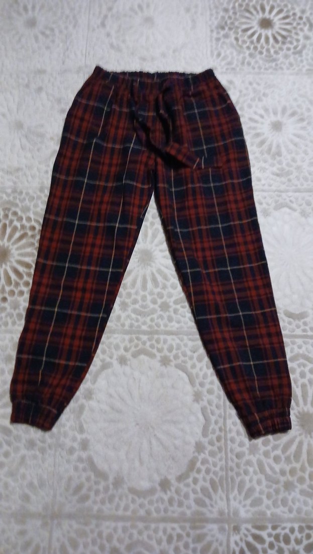 Rahat kesim kadın kumaş pantolon. Koyu kırmızı ekose desenli, yumuşak ve sıcak kumaş.