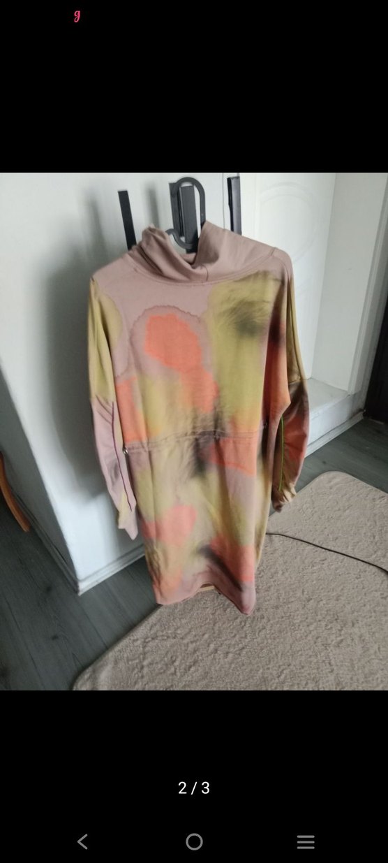 Bu uzun kesim hamile tunik, rahat kesim ve uzun kollara sahiptir. Yumuşak sentetik kumaştan üretilmiş, pastel batik desenli ve drapeli detaylar içerir. ben elbise olarak kullandım tasarım ürün yumuşacık penye