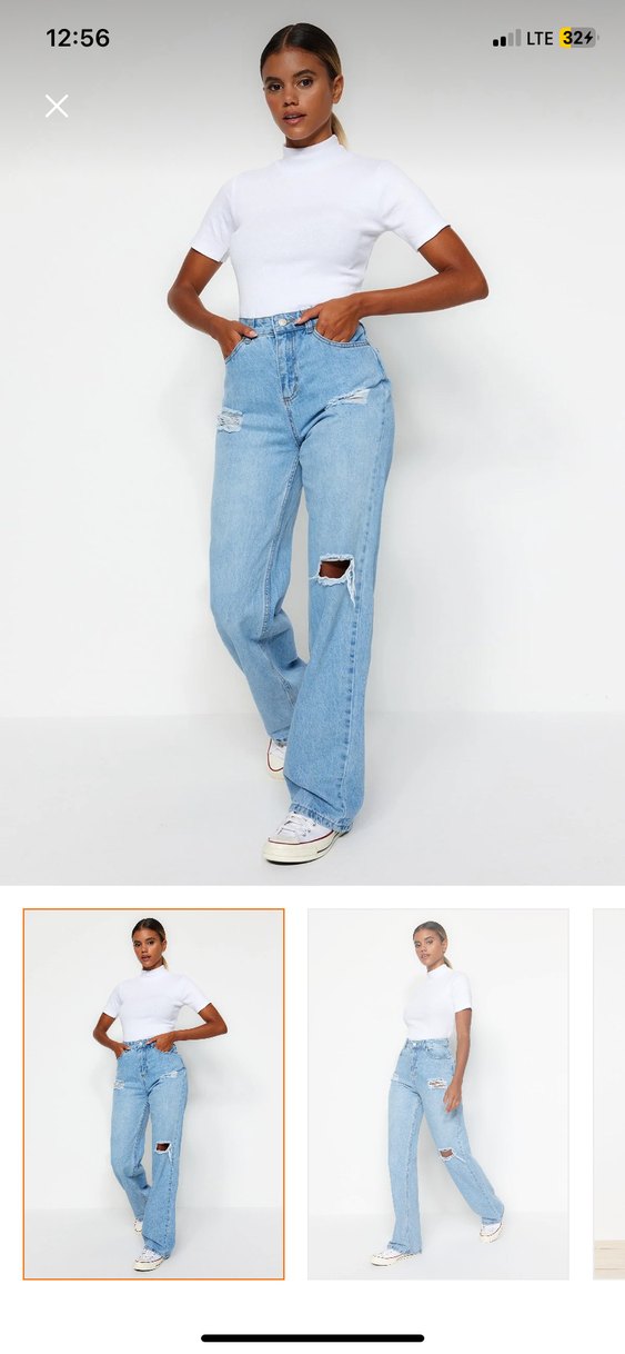 Açık mavi kot pantolon, rahat kesim ve midi boyda, hafif yırtık detaylarla günlük sokak stili için uygundur. Rahat ve şık bir görünüm sunar.