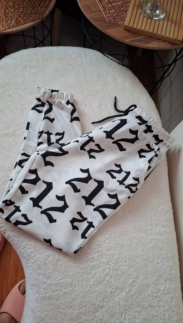 Yumuşak tekstilden üretilmiş, siyah baskılı desenli beyaz rahat kesim midi boy sweatpant. Günlük kullanıma uygun, rahat ve şık bir sokak stili parçası. ✨ çok az kullanıldı tertemiz sorunsuz