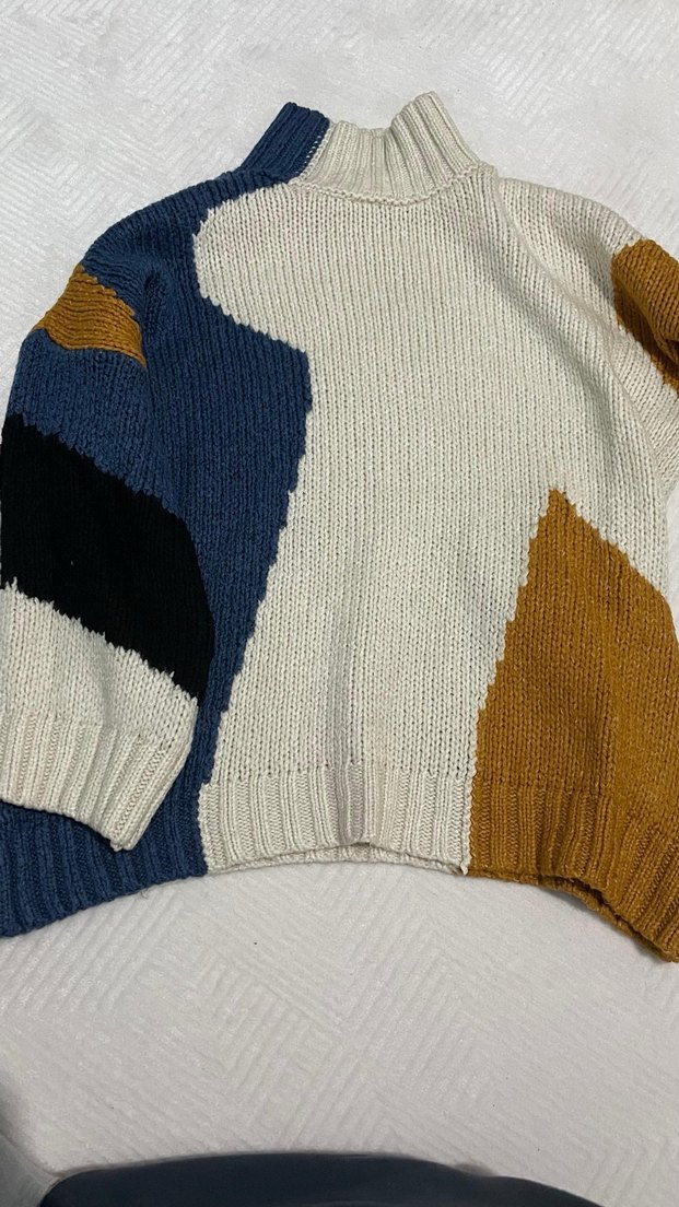 Boğazlı, örgü kadın kazak; rahat kesim, uzun kollu, çok renkli (gri, mavi, siyah, kahverengi) ve günlük kullanım için uygundur.