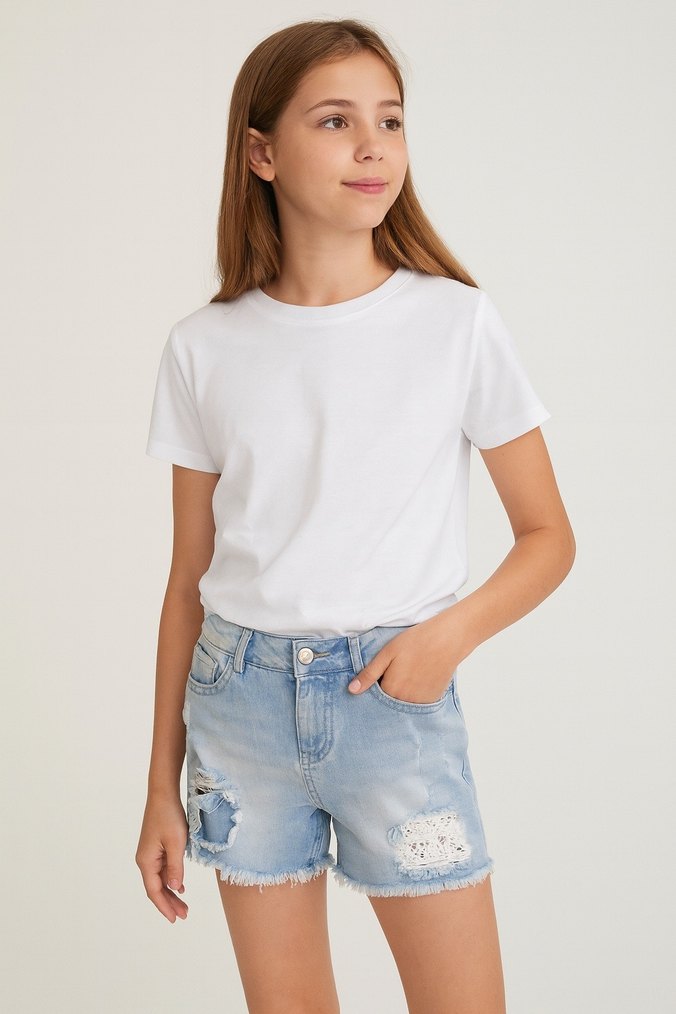 Kızlar için rahat kesim, açık renkli batik desenli denim şort. Sokak modasına uygun, zahmetsiz şıklık sunar. #denim #şort #lcw #kız #gençkız #giyim