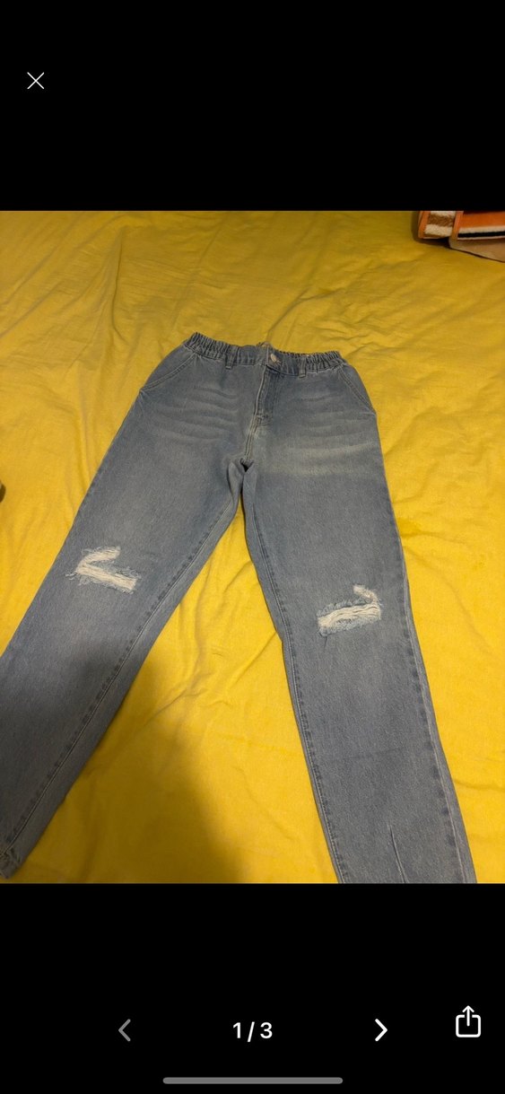 Rahat kesim, elastik bel bantlı denim pantolon. Yırtık detaylarıyla sokak modasına uygun, günlük kullanıma uygun midi boy pantolon.