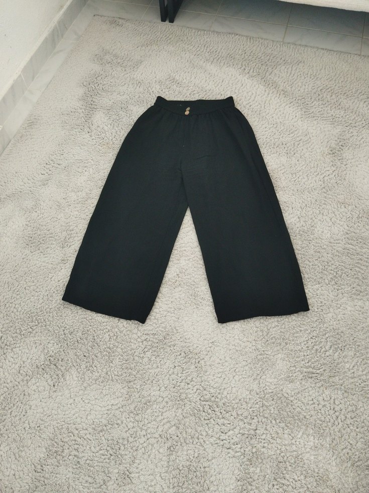 siyah renkli, rahat kesim ve midi boyda, yumuşak kumaştan günlük kullanıma uygun şık kadın pantolonu.