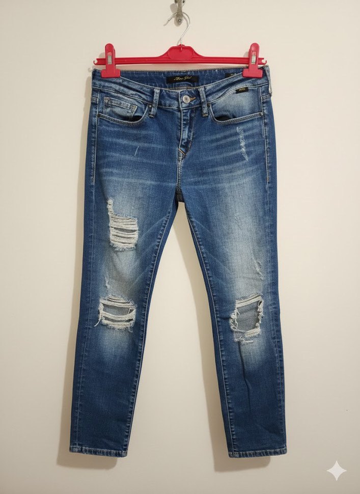 Rahat kesim ve normal boyda mavi kot pantolon. Yıpranmış detaylara ve tokalı tasarıma sahiptir, günlük sokak stili için uygundur.