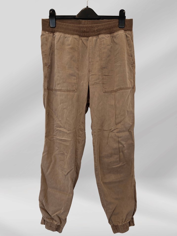 Kemer detaylı, bol kesim bej keten pantolon. Elastik paçalarla rahat ve günlük sokak stili için uygun.