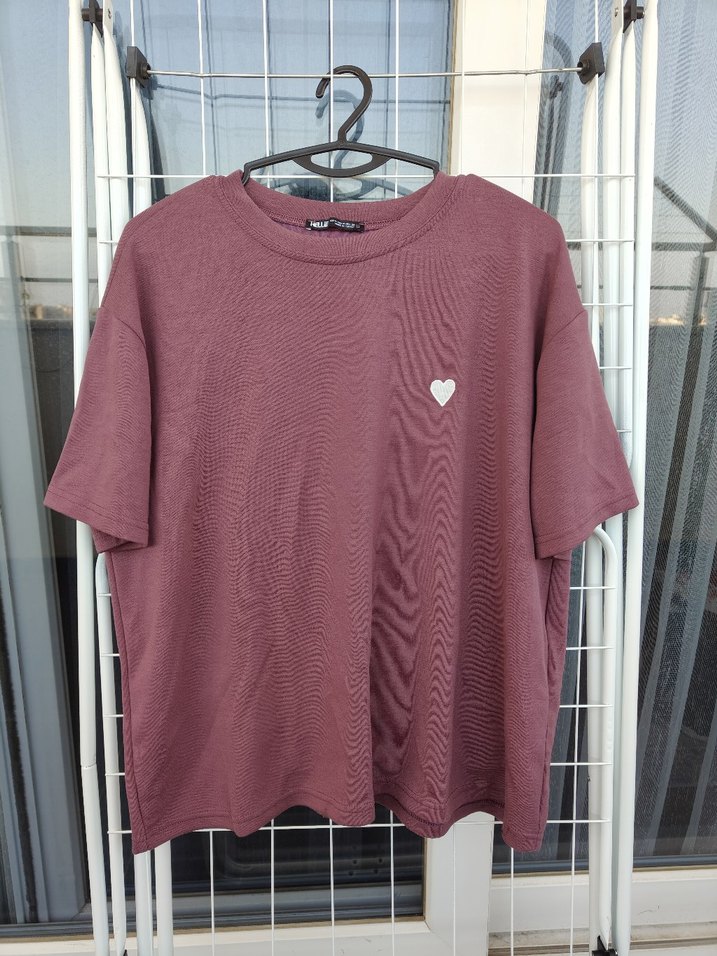 Bordo renk pamuklu kumaştan kısa kollu, yuvarlak yakalı ve rahat kesim kadın tişört. Küçük kalp detayıyla sade ve şık. ❤️