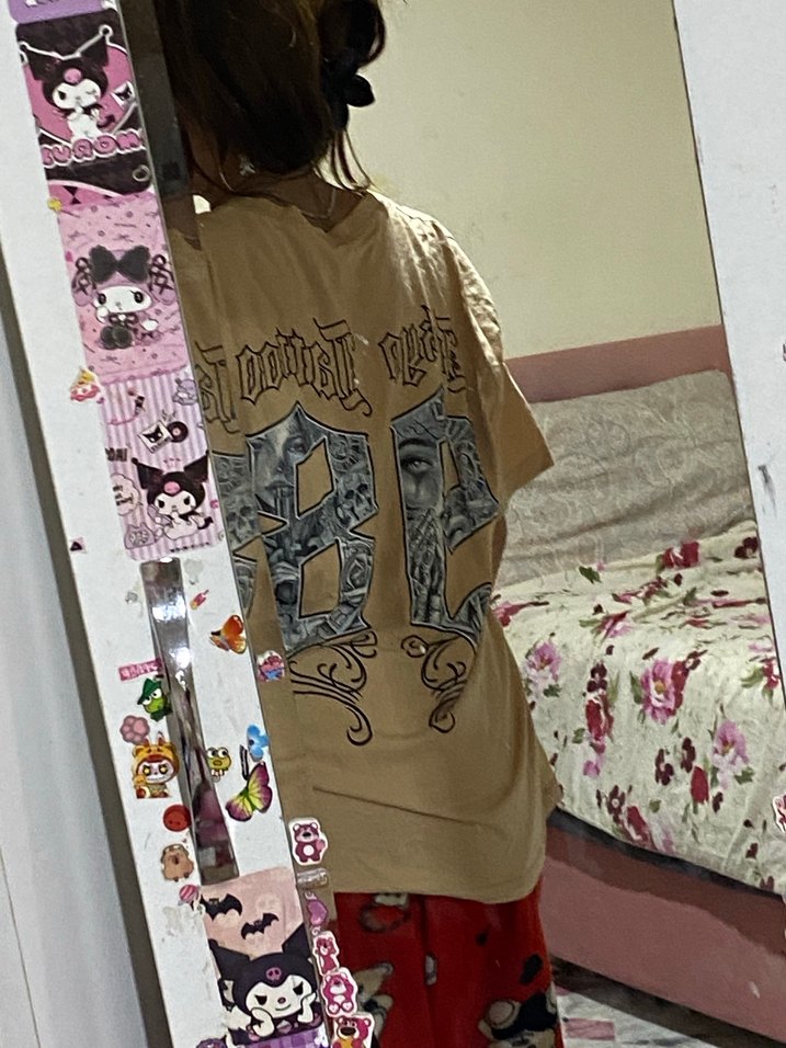 Bej renkli, baskılı ve rahat kesim kısa kollu kadın tişörtü. Paper benzeri malzemeden üretilmiş, günlük kullanıma uygun midi boyda ve bisiklet yaka.