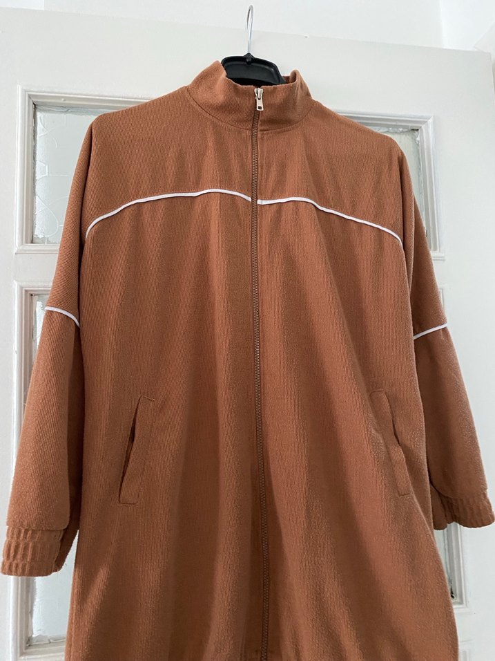 Kahverengi, parlak görünümlü, yüksek yakalı ve uzun kollu rahat kesim kadın ceket. Fermuarlı ve midi boyda, günlük sokak stili için uygundur.