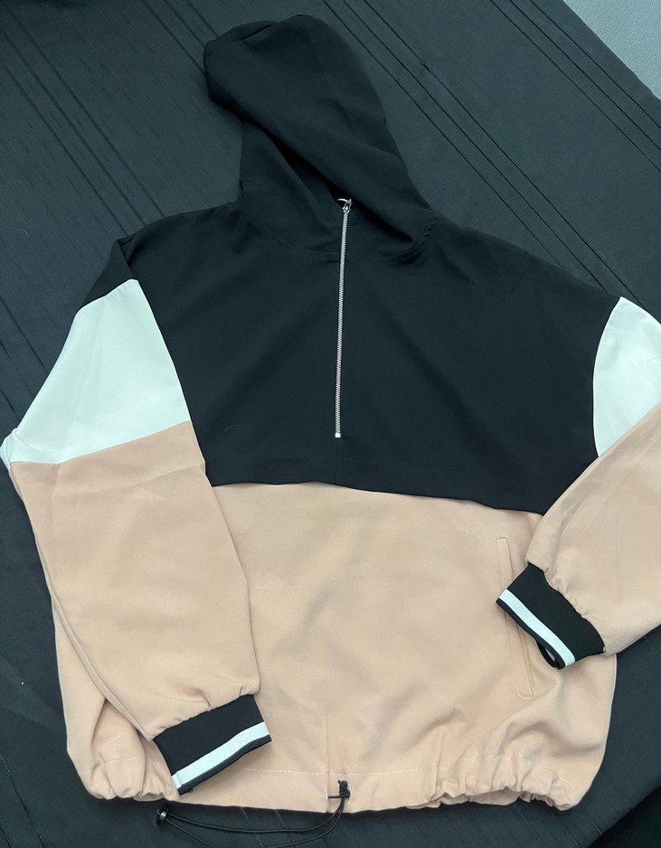 Kadınlar için kapüşonlu, uzun kollu, kısa ve rahat kesim sweatshirt. Ön üst kısmında fermuar bulunur, siyah, bej ve beyaz renklerin birleşimi yumuşak kumaşla sunulur. Günlük kullanıma uygun.
