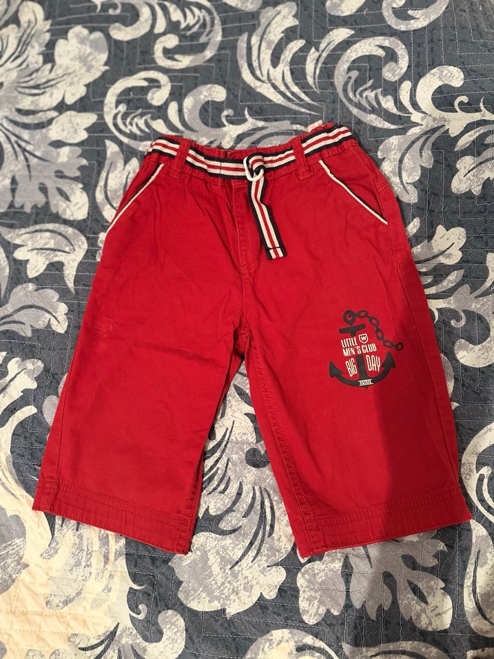 Pamuk kumaştan, rahat kesim ve renkli baskılı, kemerli kırmızı erkek şort, trend sokak stili için uygundur.