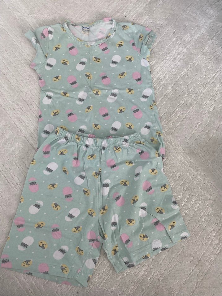 Rahat kesim, kısa kollu ve yuvarlak yaka pijama takımı. Pastel çok renkli baskılı, kısa üst ve şortlu set.
