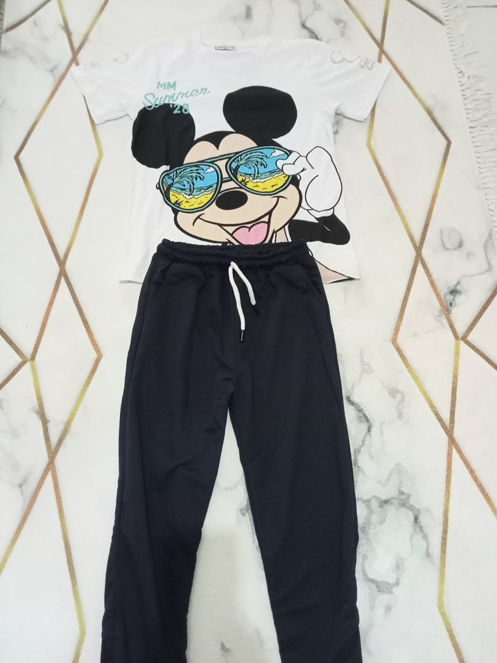 Rahat kesim, baskılı pamuk kısa kollu tişört ve lacivert eşofmandan oluşan kız çocuk takımı, zahmetsiz şıklık sunar.
