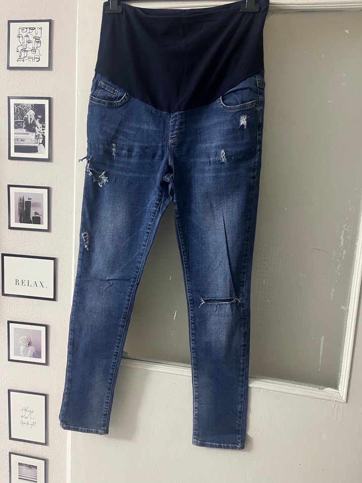 Koyu mavi hamile kot pantolon, rahat kesim ve esnek bel bandıyla günlük kullanım için uygundur. Hafif yıpranmış detayları ve tokalı özelliğiyle sokak stiline uygundur.