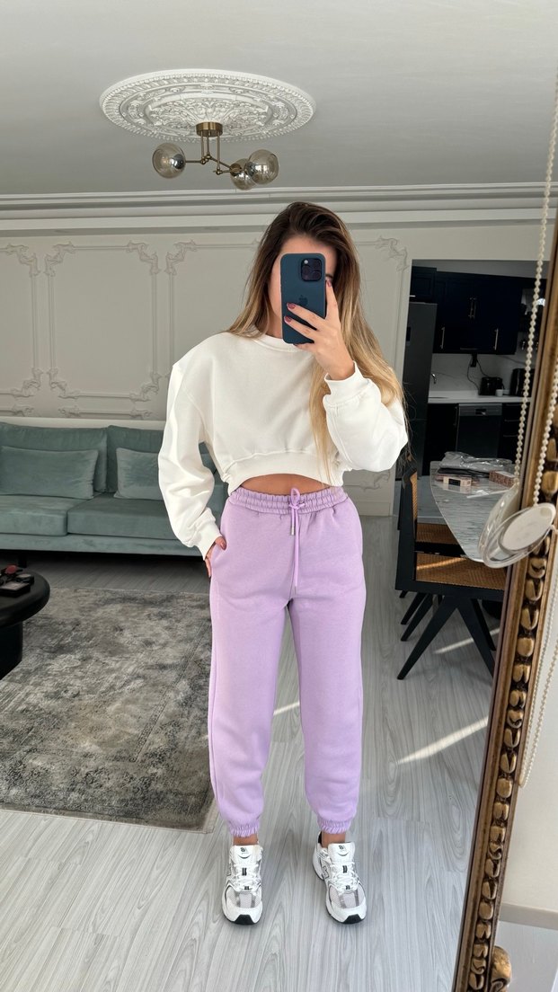 Yumuşak ve sıcak kumaştan, lila tonlarında, bağcıklı ve rahat kesim kadın eşofman. Kalın şardonlu karda kışta gıyılır normal terletir. Hiç giyilmedi. Xs-s bedene uygun