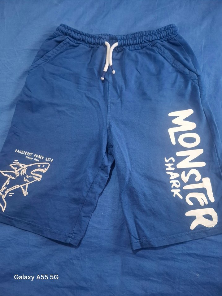 Rahat kesim mavi denim şort, renkli baskılı tasarıma ve ayarlanabilir bağcığa sahip. Rahat ve gündelik kullanım için ideal.