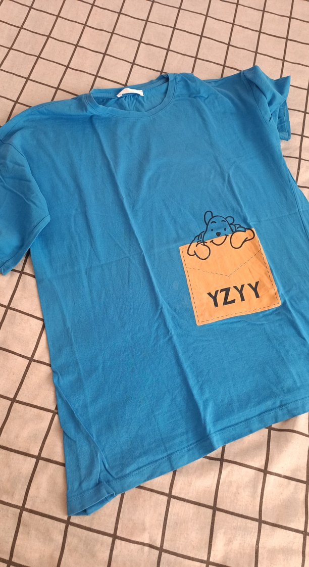 Rahat kesim, kısa kollu mavi hamile tişörtü. Cepte renkli baskı ve fermuar, üzerinde YZYY yazısı bulunur. Günlük kullanıma uygun yumuşak kumaş.