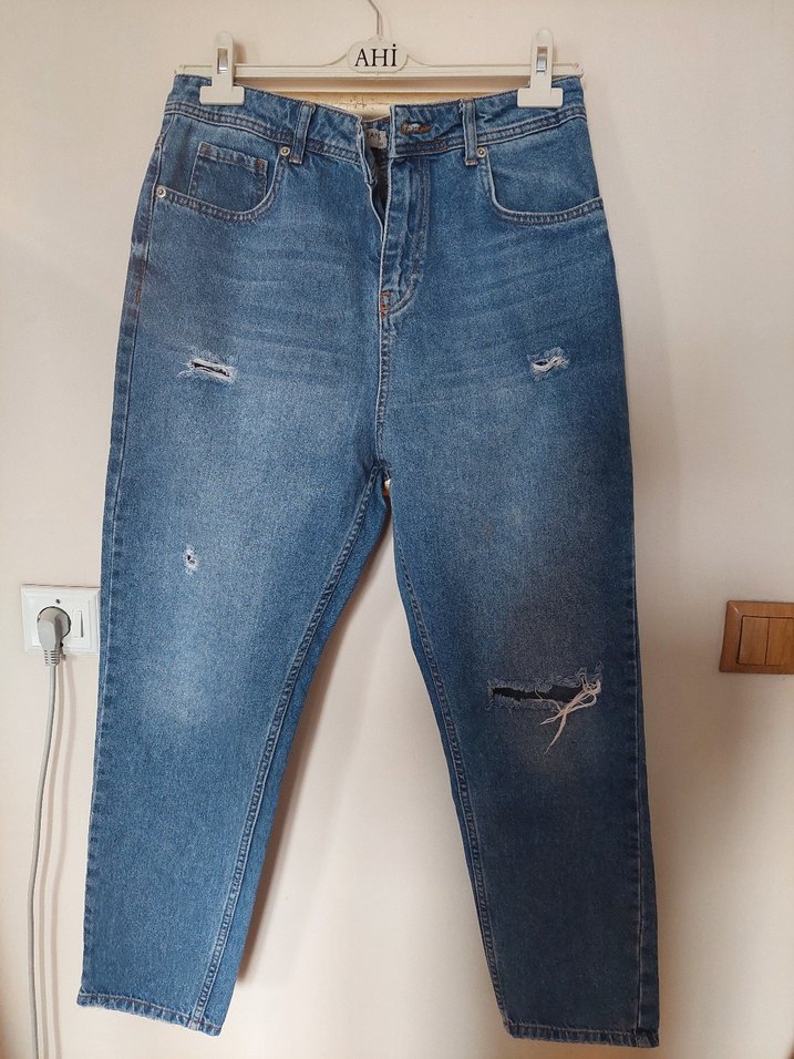 Mavi renkli, rahat kesim, midi boy kot pantolon. Hafif yıpranmış detaylar günlük sokak stili için uygundur.