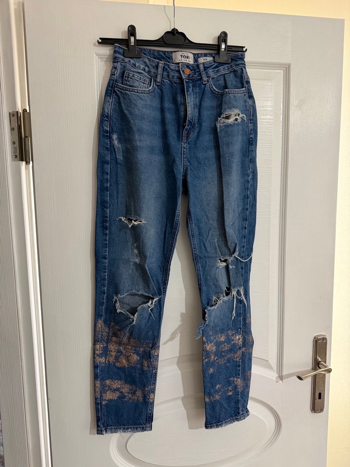 Rahat kesim, yırtık detaylı ve hafif batik desenli mavi kot pantolon. Tokalı detayıyla günlük kullanıma uygun, trend sokak stili.