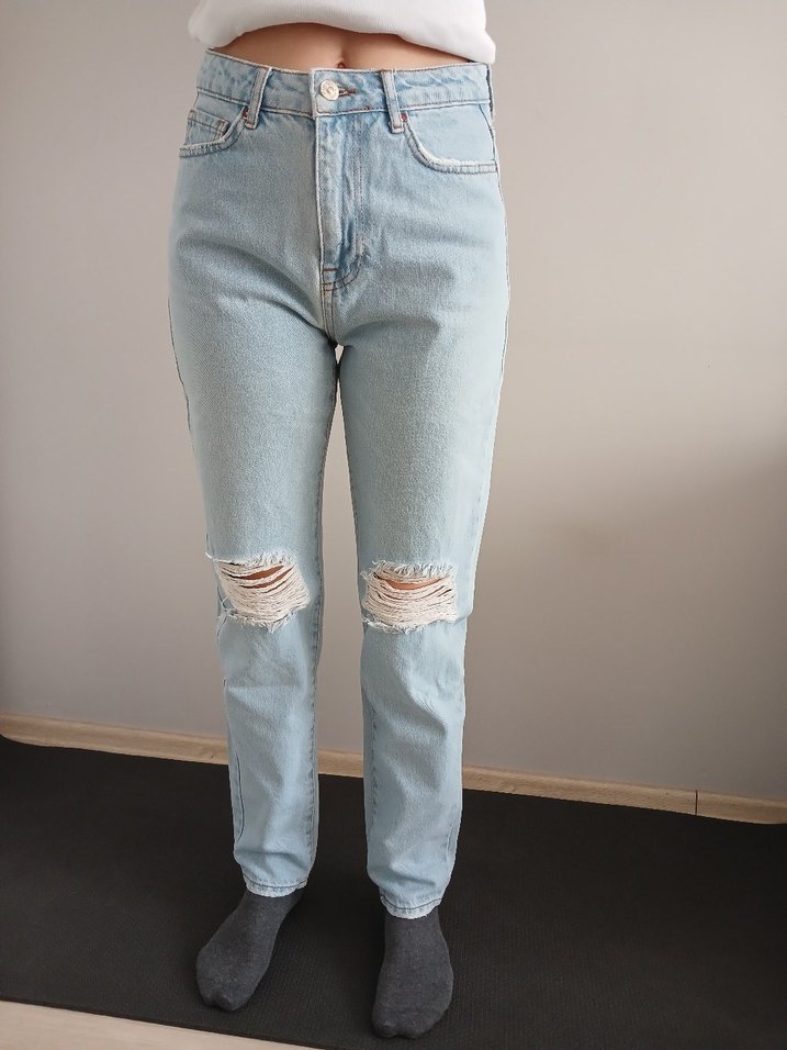 Pastel mavi renkte, dizlerinde yırtık detaylı, rahat kesim midi boy denim kadın jean, gündelik sokak stili için uygun.