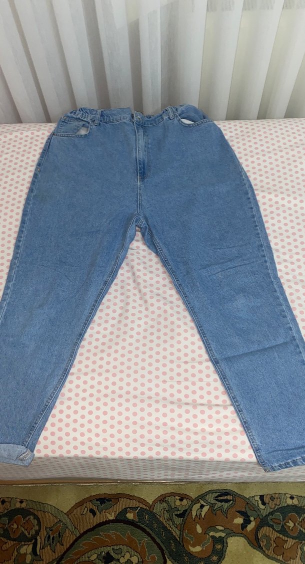 Rahat kesim, midi boyunda, pastel mavi renkte kot kumaşından kadın pantolonu. Desensiz ve günlük kullanıma uygun, 44 beden 85 kg kadar olur