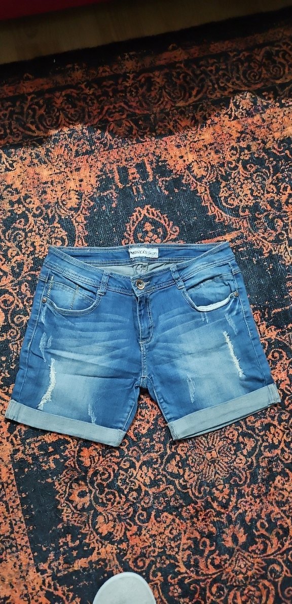 Mavi denimden yapılmış, rahat kesim ve kısa boyda, hafif yıpranmış detaylara sahip rahat şort. Katlanmış paça, günlük sokak stili için uygun.