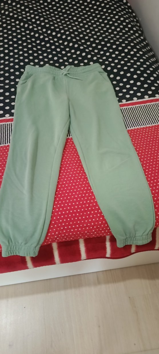 Yumuşak ve sıcak kumaştan yapılmış, pastel yeşil renkte rahat kesim eşofman altı. Konforlu ve şık görünüm için lastikli bel ve paçalar içerir. Günlük kullanım için uygundur.