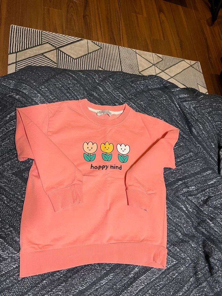 Uzun kollu, bisiklet yaka, rahat kesim pembe kız sweatshirtü. Yumuşak, örme kumaştan, renkli çiçek baskılı ve 'happy mind' yazılı.