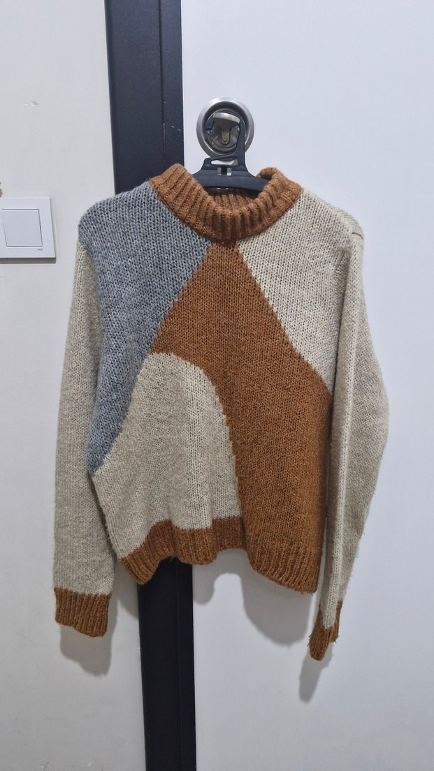 Kadınlar için rahat kesim, uzun kollu ve yuvarlak yakalı örgü kazak. Kahverengi, gri ve bej renk bloklarıyla günlük kullanıma uygun. Yünlü ve çok rahat her şeyle kombinlenebilir.